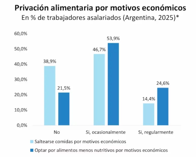 El informe también señala que cada vez más trabajadores optan por saltear comidas para poder afrontar otros gastos esenciales del hogar. Esta tendencia refleja el impacto directo de la inflación en la vida cotidiana y evidencia el deterioro del salario real en los últimos años.